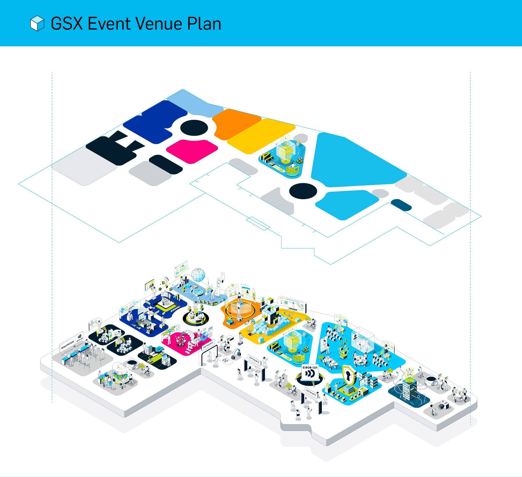 Instead of a traditional floor plan, I designed an isometric map that presents the venue as a connected world.